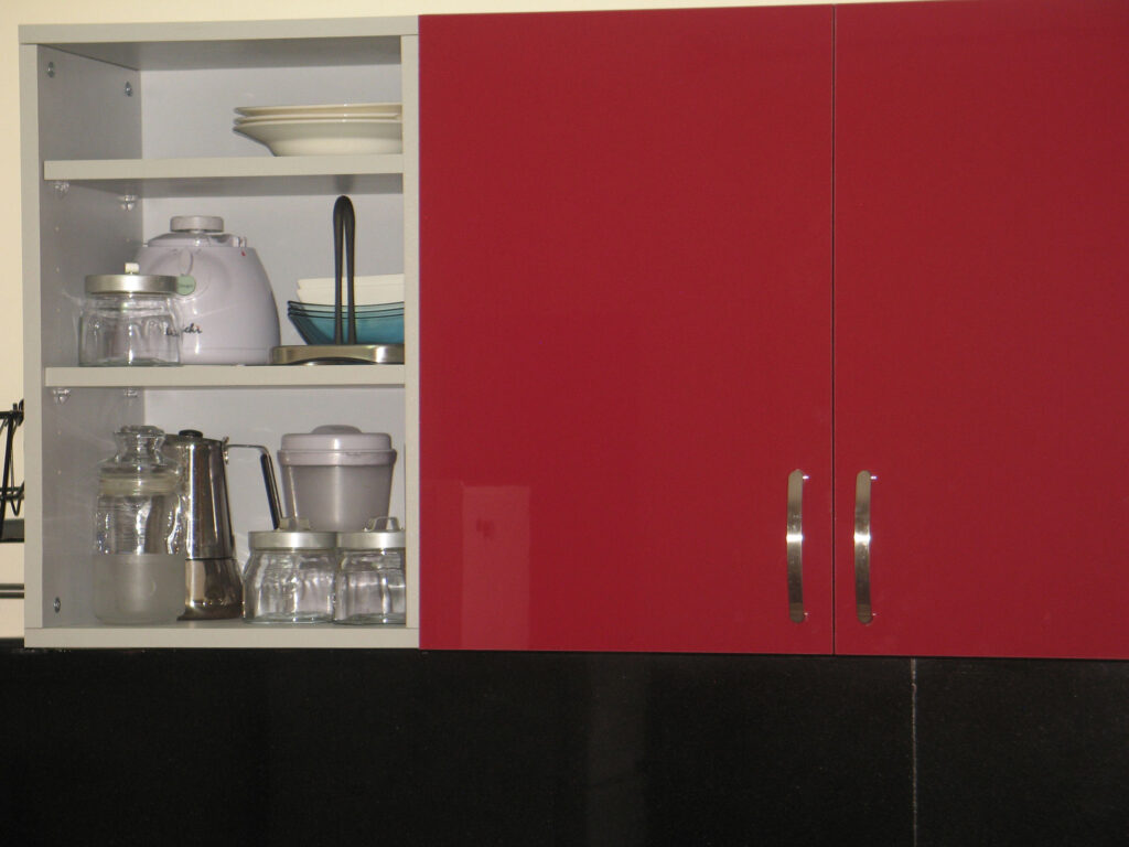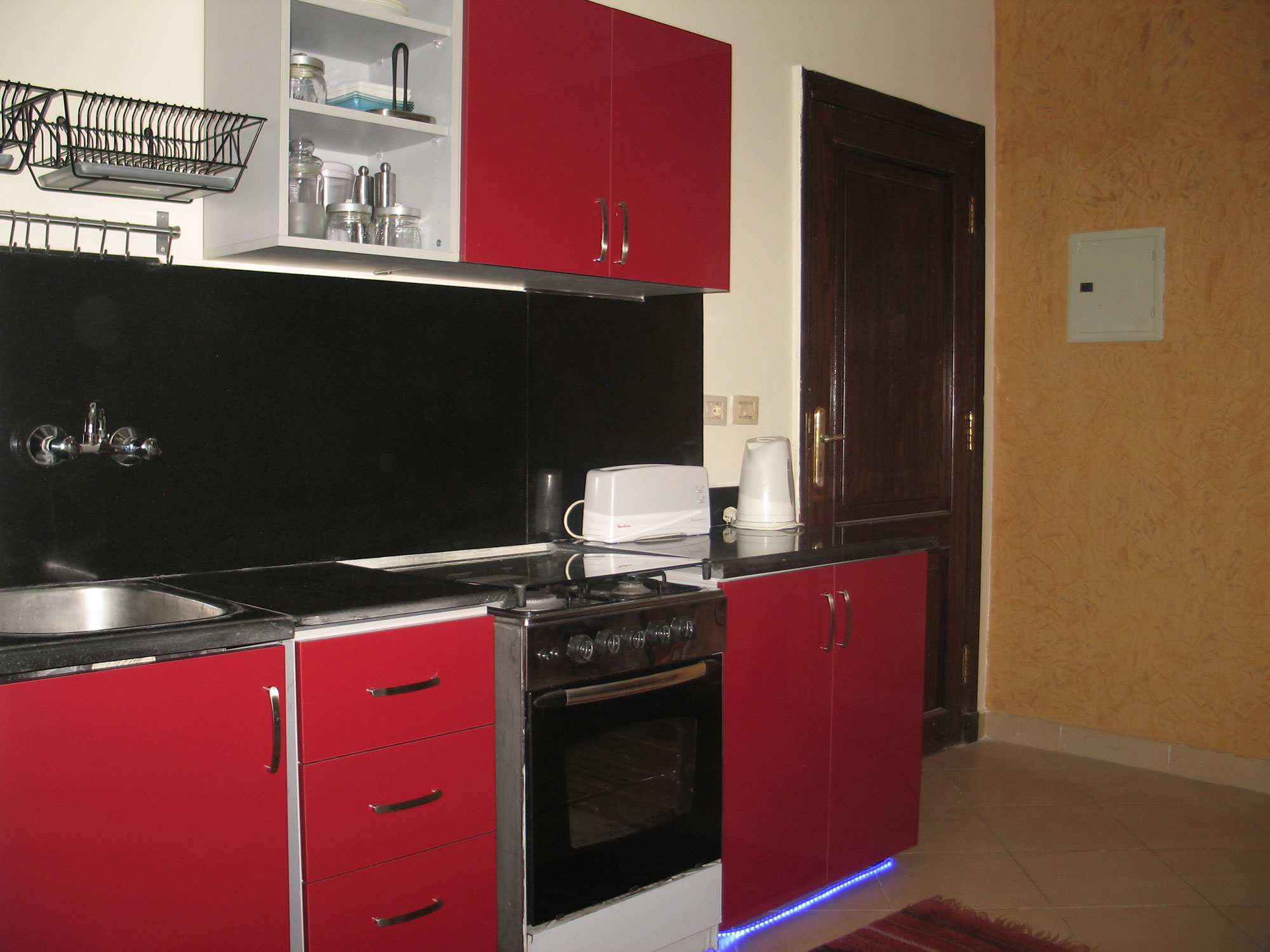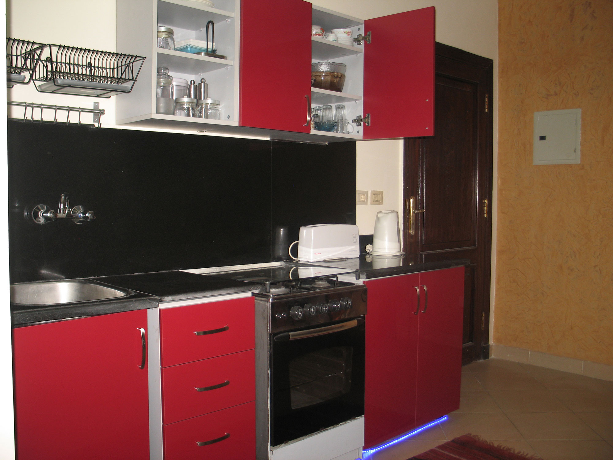 كما تحتوي الشقه علي مطبخ صغير حديث مجهز بجميع الأدوات اللازمة