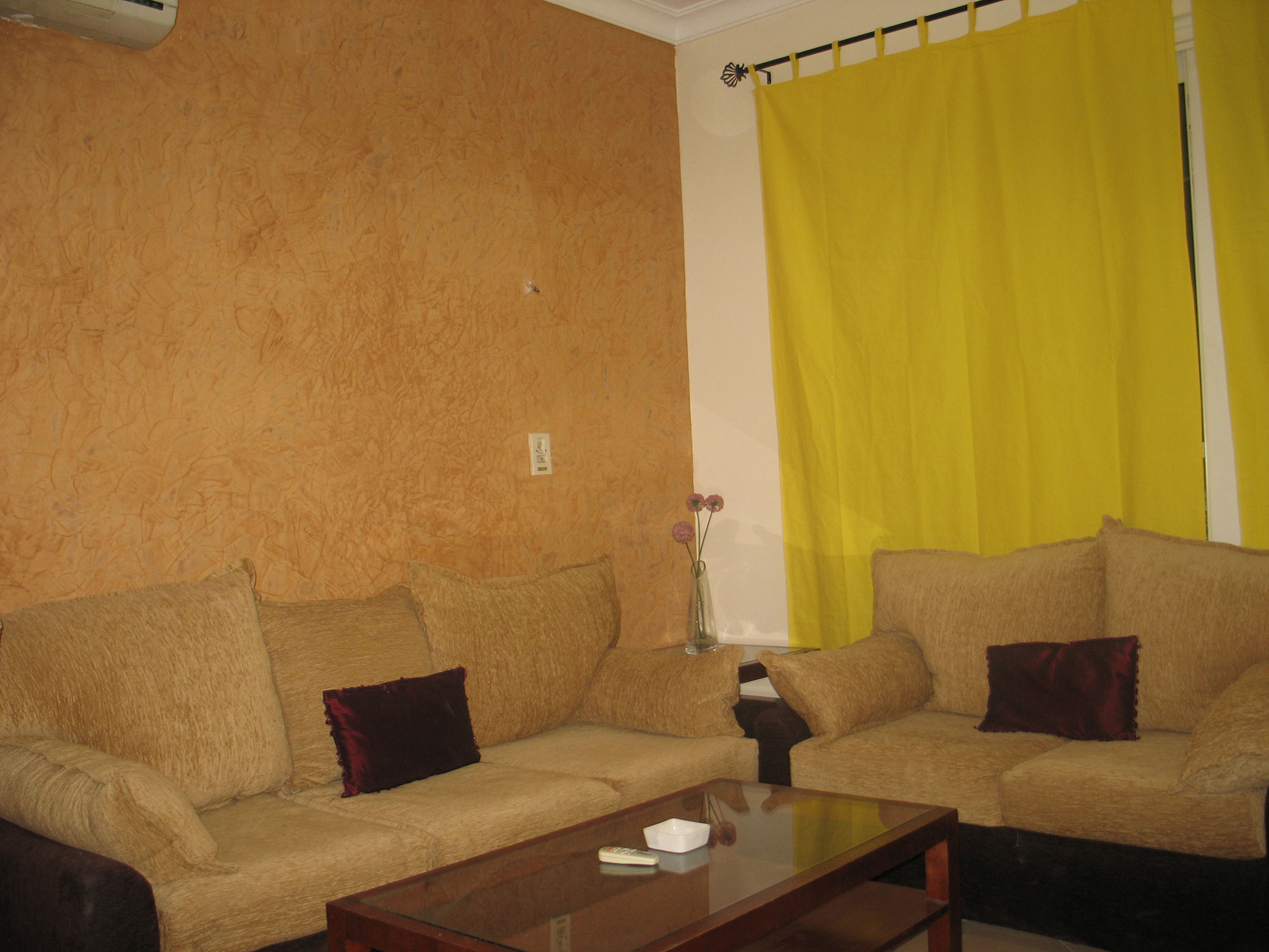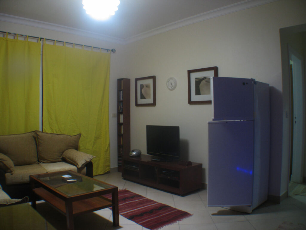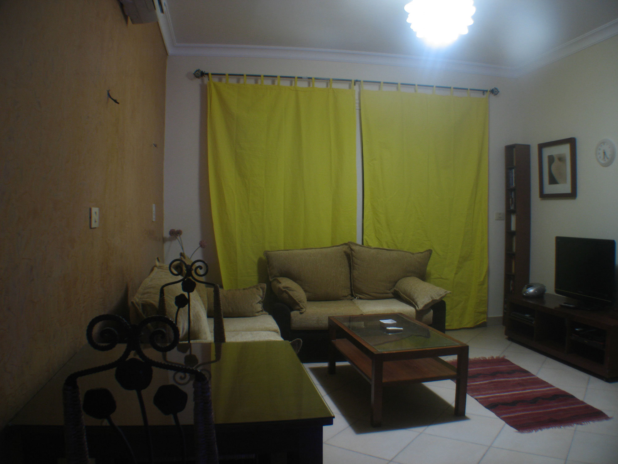غرفه المعيشه بها اريكه مريحه و طاوله قهوه, ومكتب صغير و تليفزيون 32 بوصه مسطح و جهاز استقبال قنوات فضائيه
